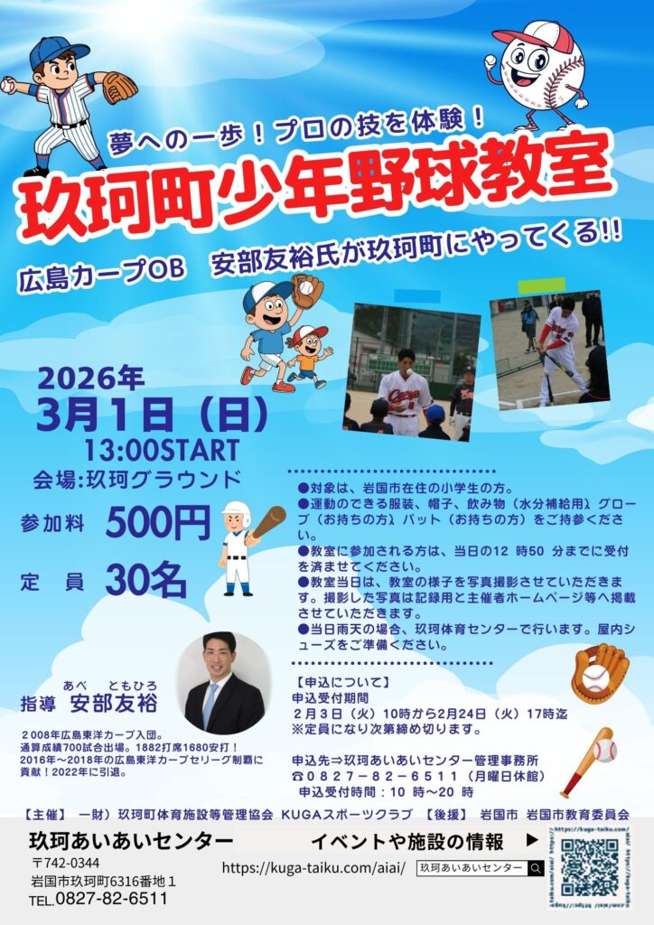 2026.01.25 ⚾玖珂町野球教室開催⚾ 夢への一歩!プロの技を体験! あの「覇気」がやってくる!元カープ安部友裕氏による特別野球教室、開催! 元広島東洋カープの安部友裕さんをコーチに招き、スペシャル野球教室を開催します! 走塁・守備・打撃のコツをプロから直接学べるチャンス。 技術はもちろん、野球を全力で楽しむための「覇気」を伝授します。プロの凄さを間近で体感して、君の野球をもっと進化させよう! KUGAスポーツクラブ イベント・大会情報 ブログ 教室 施設 玖珂グラウンド