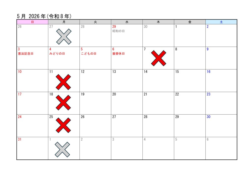 ×・・・休館日 5月7日(木)が振替で休館になります。