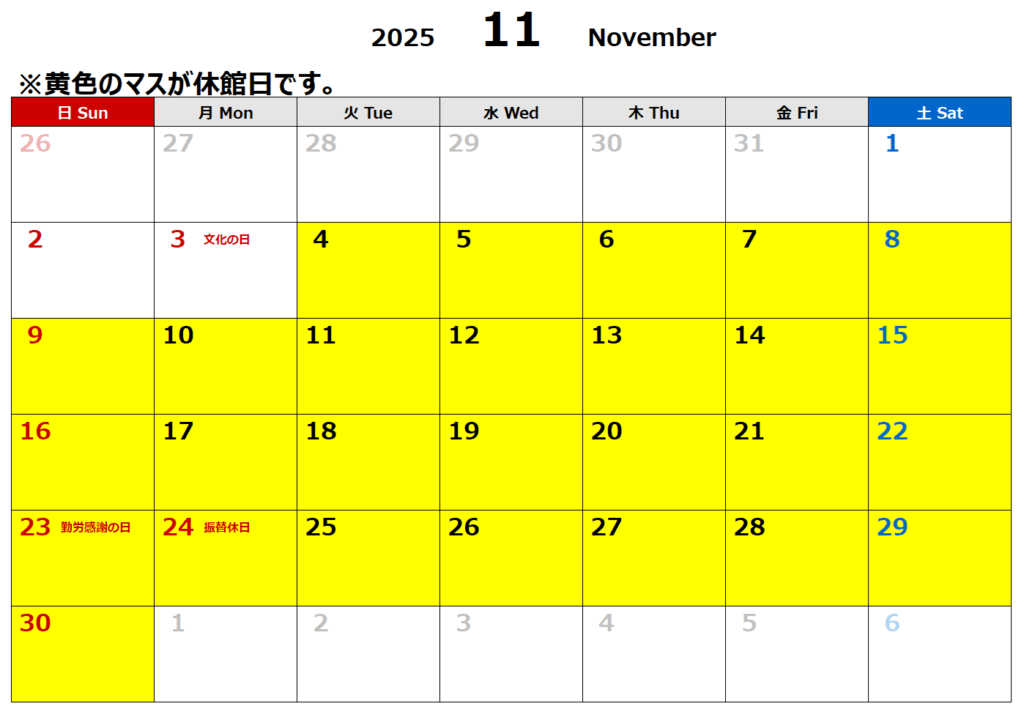 2025.10.15 11月の休館について(2025.10.24更新) いつも温水プールグリーンオアシスをご利用いただき、誠にありがとうございます。 11月の休館日は以下のとおりです。 11月4日(火)~12月12日(金) ※3日(月)は祝日のため、営業いたします。(10:00~18:00) ※4日(火)~12月12日(金)は工事のため休館です。 お知らせ イベント プール 休館日