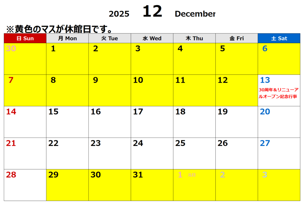 2025.11.20 12月の休館について いつも温水プールグリーンオアシスをご利用いただき、誠にありがとうございます。 12月の休館日は以下のとおりです。 1~12日(金)、15日(月)、22日(月)、29日(月)~1月4日(日) ※ 1日(月)~12日(金)は工事のため休館となります。 ※ 年内の営業は28日(日)までです。 ※ 29日(月)~1月4日(日)までは年末年始の休館日にあたります。 工事と年末年始の休館のため営業日が少なくなっており、ご利用される皆様には大変ご迷惑をおかけしますが、ご理解の程よろしくお願い申し上げます。 お知らせ プール 休館日